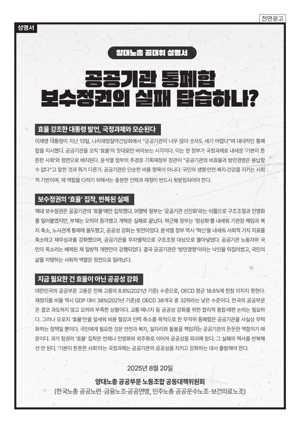 성명서 / 공공기관 통폐합 보수정권의 실패 답습하나?